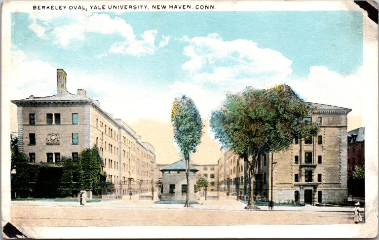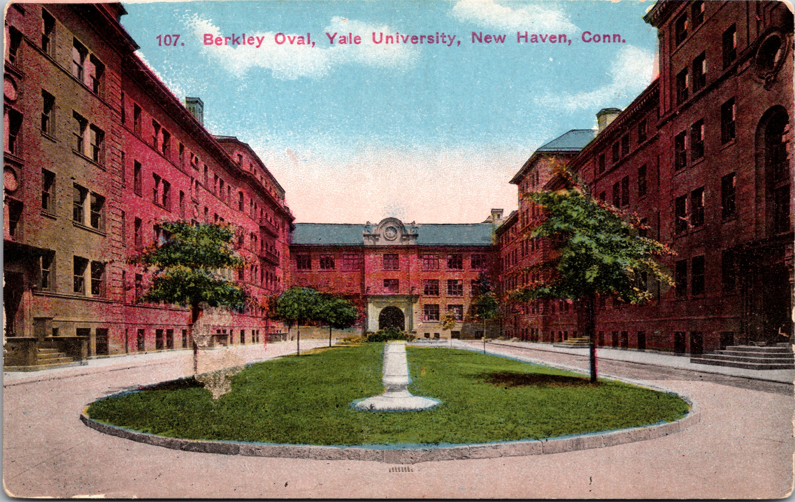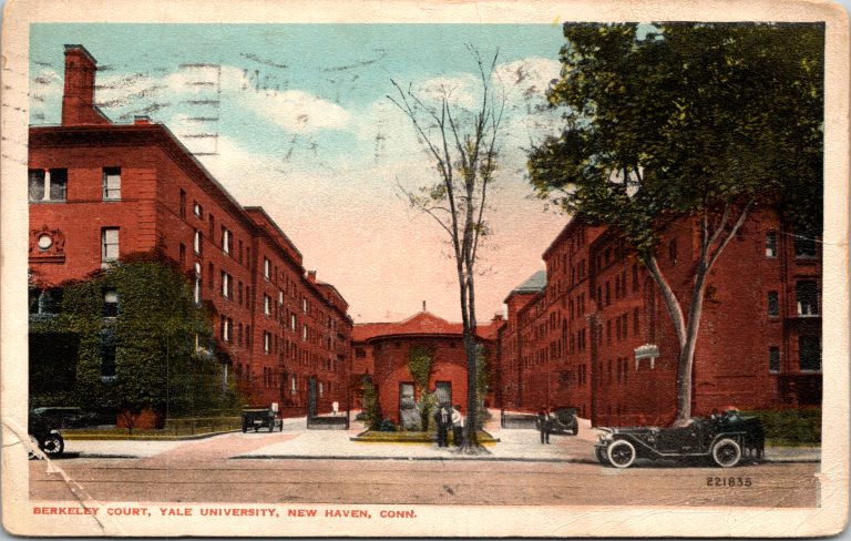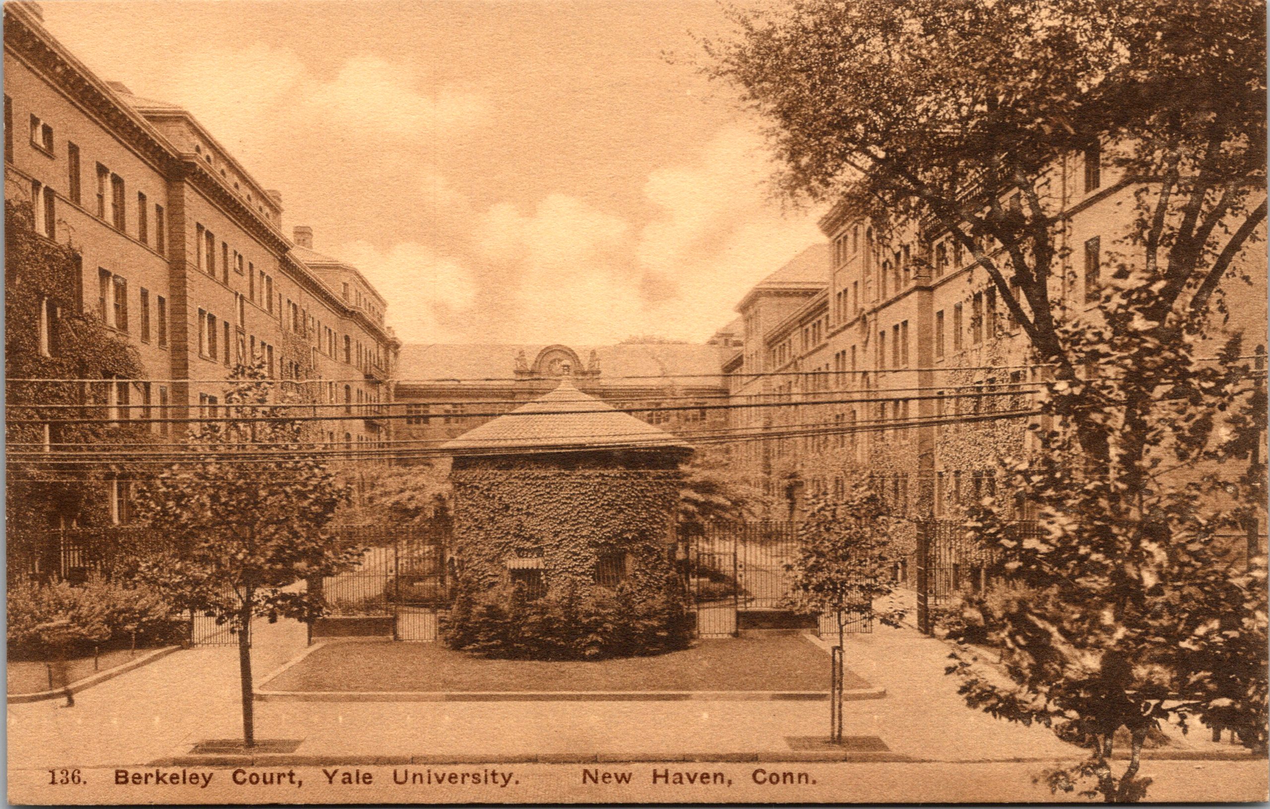 Berkeley College opened in 1934 and was named for George Berkeley (1685–1753), the Irish-Anglo philosopher-bishop whose writings influenced early American education and whose books went to Yale. Its Collegiate Gothic courtyards were designed by James Gamble Rogers to look “timelessly old”—yet the Berkeley site had been a very mixed patchwork before 1932 demolition cleared the block: boarding houses, small commercial structures, some tenement-scale flats, a scattering of wood-frame dwellings from the 19th century, and light service shops pinned between Elm/College/Grove. In fact, parts of the footprint straddled old blocks once considered the “edge” of campus before the Gothic expansion era. Berkeley’s signature South Court (with the five-story Branford/Entryway tower silhouette) gave it a distinct vertical profile among the early colleges—making it feel compressed, dense, almost Oxford-urban in comparison to the more open Branford/RH layout next door.