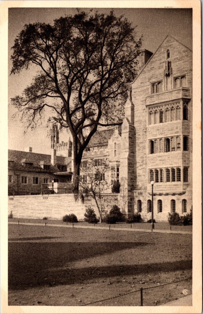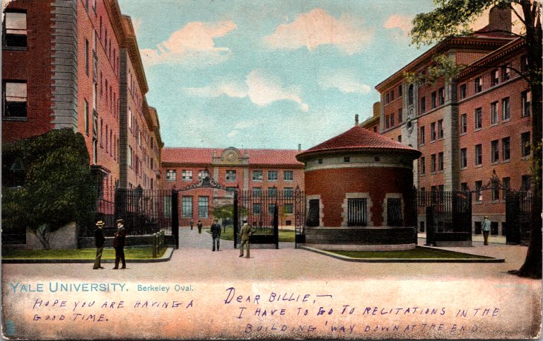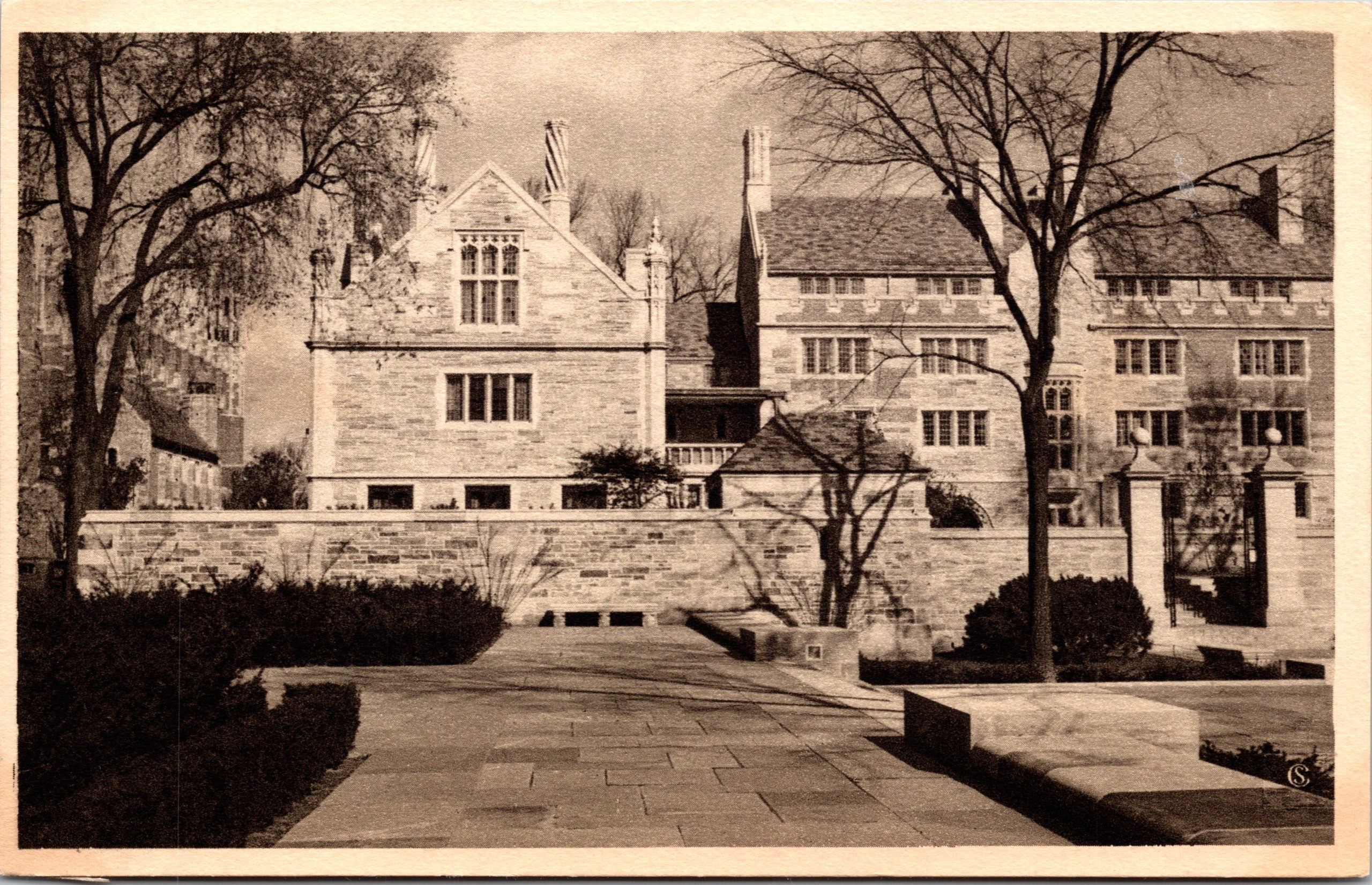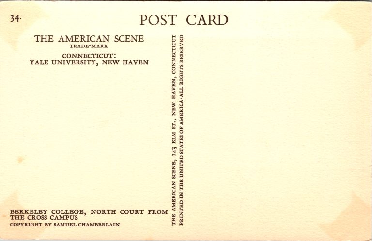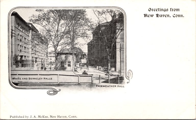 Berkeley College opened in 1934 and was named for George Berkeley (1685–1753), the Irish-Anglo philosopher-bishop whose writings influenced early American education and whose books went to Yale. Its Collegiate Gothic courtyards were designed by James Gamble Rogers to look “timelessly old”—yet the Berkeley site had been a very mixed patchwork before 1932 demolition cleared the block: boarding houses, small commercial structures, some tenement-scale flats, a scattering of wood-frame dwellings from the 19th century, and light service shops pinned between Elm/College/Grove. In fact, parts of the footprint straddled old blocks once considered the “edge” of campus before the Gothic expansion era. Berkeley’s signature South Court (with the five-story Branford/Entryway tower silhouette) gave it a distinct vertical profile among the early colleges—making it feel compressed, dense, almost Oxford-urban in comparison to the more open Branford/RH layout next door.