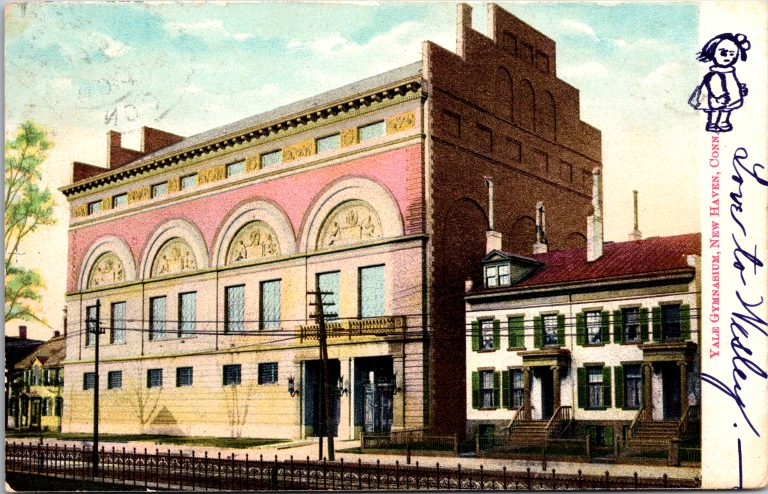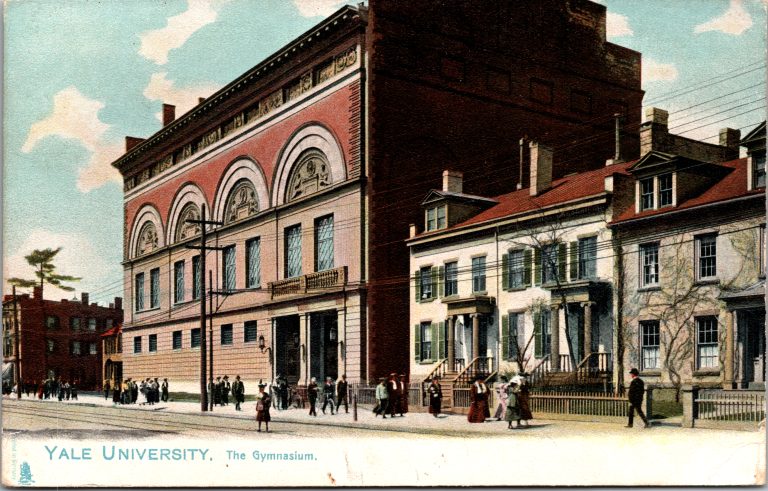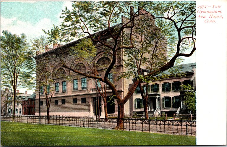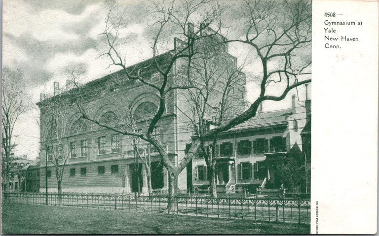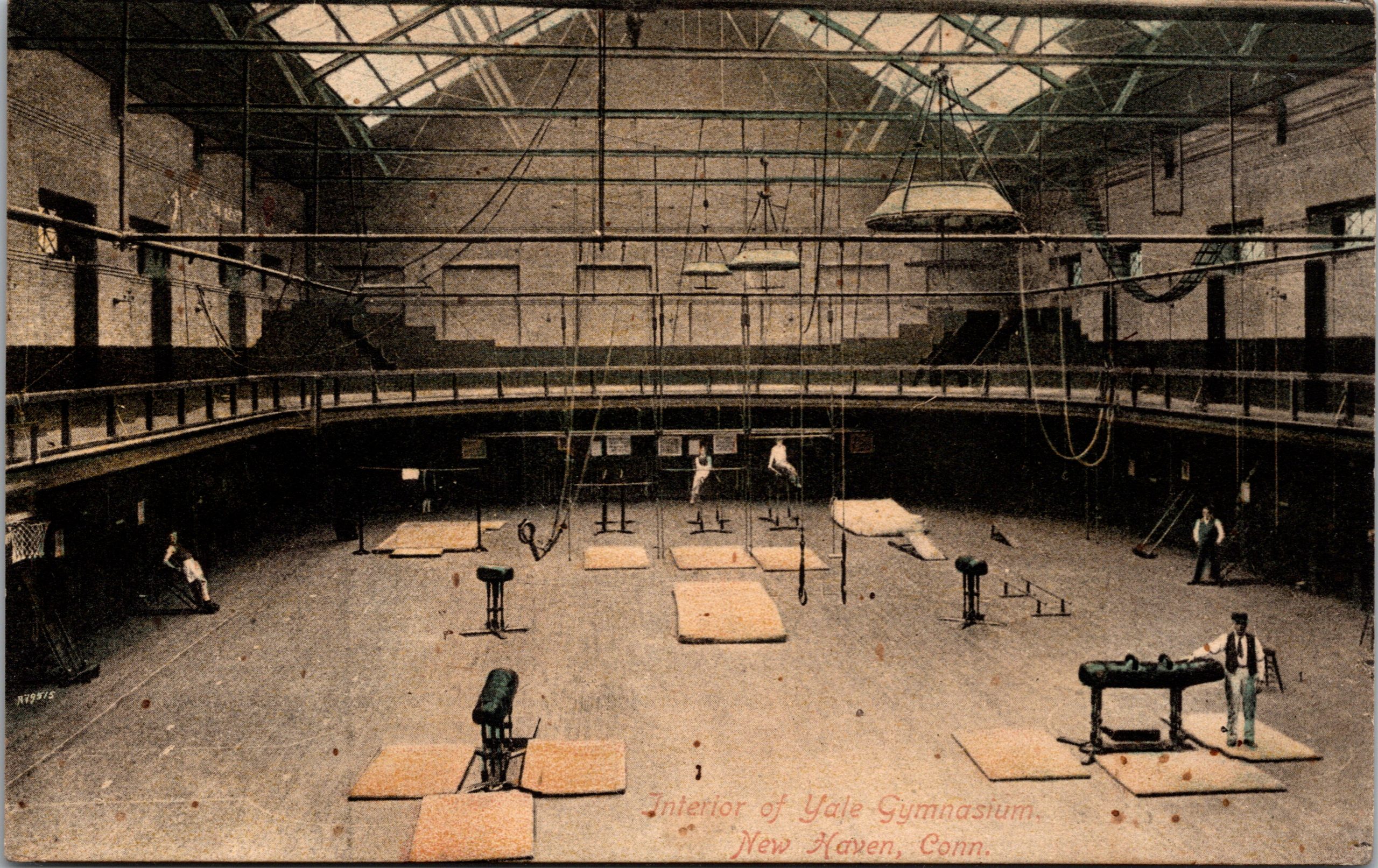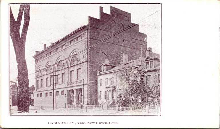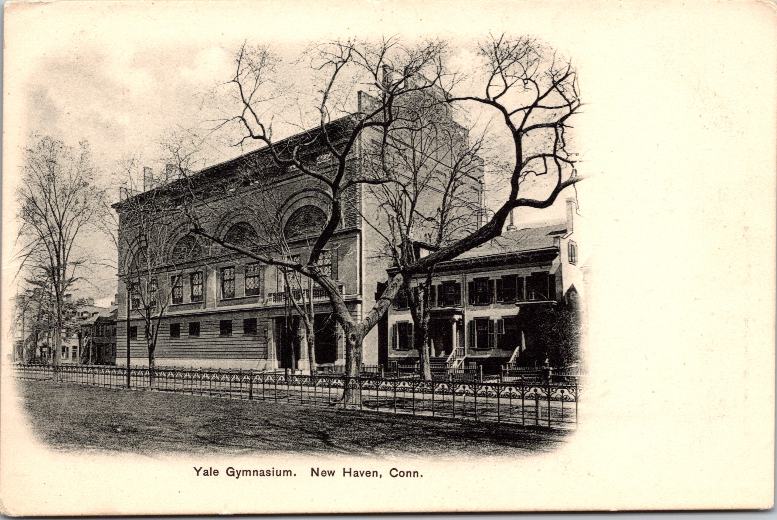 Yale’s Old Gymnasium, built between 1890 and 1892, was the university’s second major athletic facility and originally stood on the site now occupied by Trumbull College’s dining hall. The massive Victorian structure on Elm Street served as the hub of Yale athletics for nearly four decades before being replaced following the opening of today’s principal Yale gym, Payne-Whitney Gymnasium. The Old Gymnasium was thoroughly equipped, housing everything from running tracks and exercise rooms to elaborate trophy displays celebrating Yale’s athletic prominence at the turn of the century. The building was also the venue for student gatherings, including early pep rallies and class meetings. By the early 1930s, however, it was demolished to make way for Trumbull College as part of the University’s new residential college system.