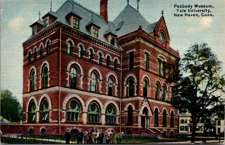 The original Peabody Museum building opened its doors in 1876 to showcase the rapidly expanding natural history collections gathered by O.C. Marsh and funded by his uncle, philanthropist George Peabody. It housed early displays of minerals, fossils, and Marsh’s now-legendary dinosaur discoveries, becoming one of the country’s foremost centers for paleontological research. By the 1910s, however, the structure was outdated and too small for the museum’s growing collections. In 1917, the original building was demolished to make way for the Harkness Memorial Quadrangle (now the site of Saybrook College), and the Peabody’s collections were placed in storage until the museum’s new, purpose-built home on Whitney Avenue opened in 1925. This new facility features a soaring two-story hall designed specifically to display Marsh’s dinosaurs and set the stage for the Peabody’s modern era.