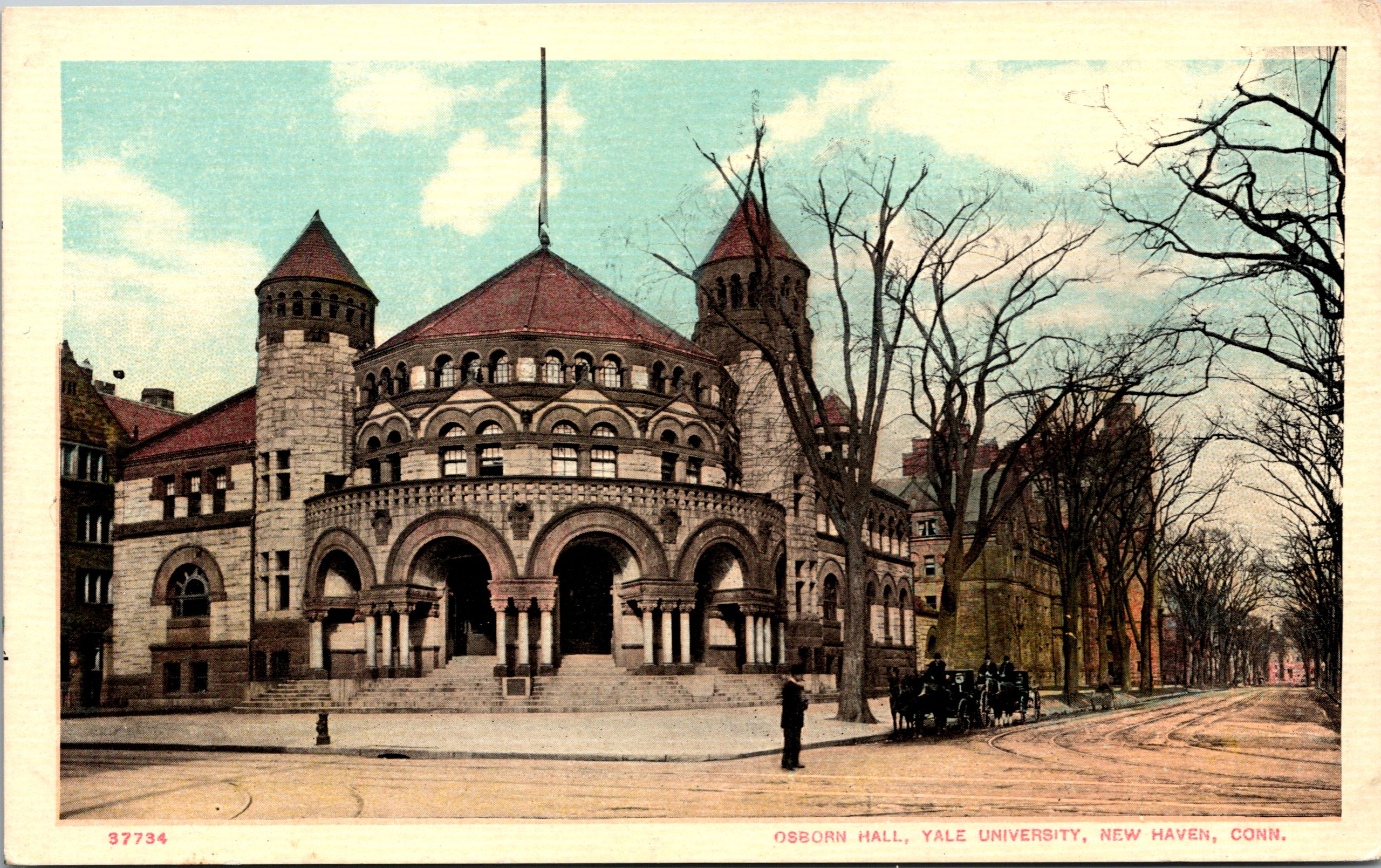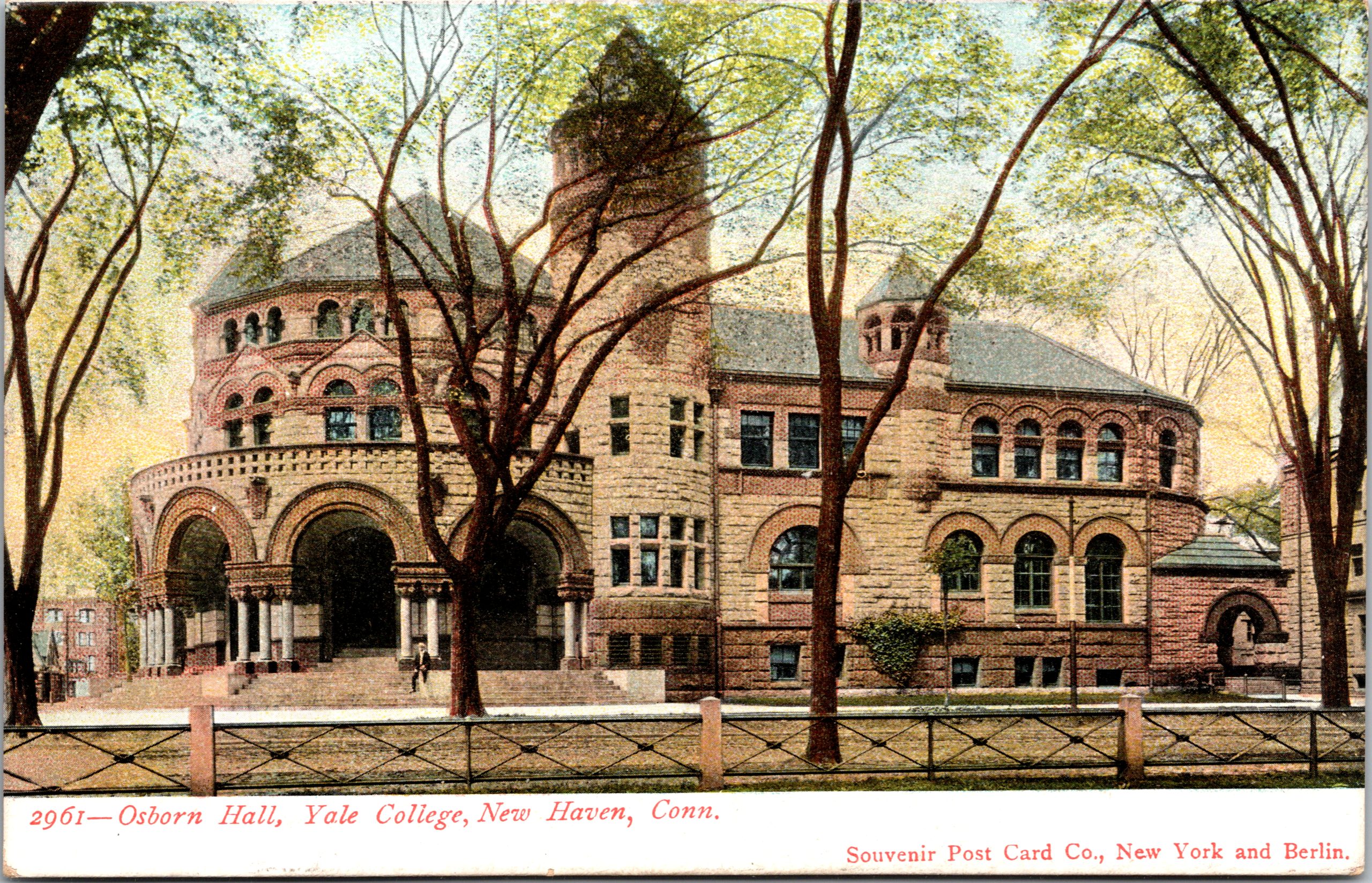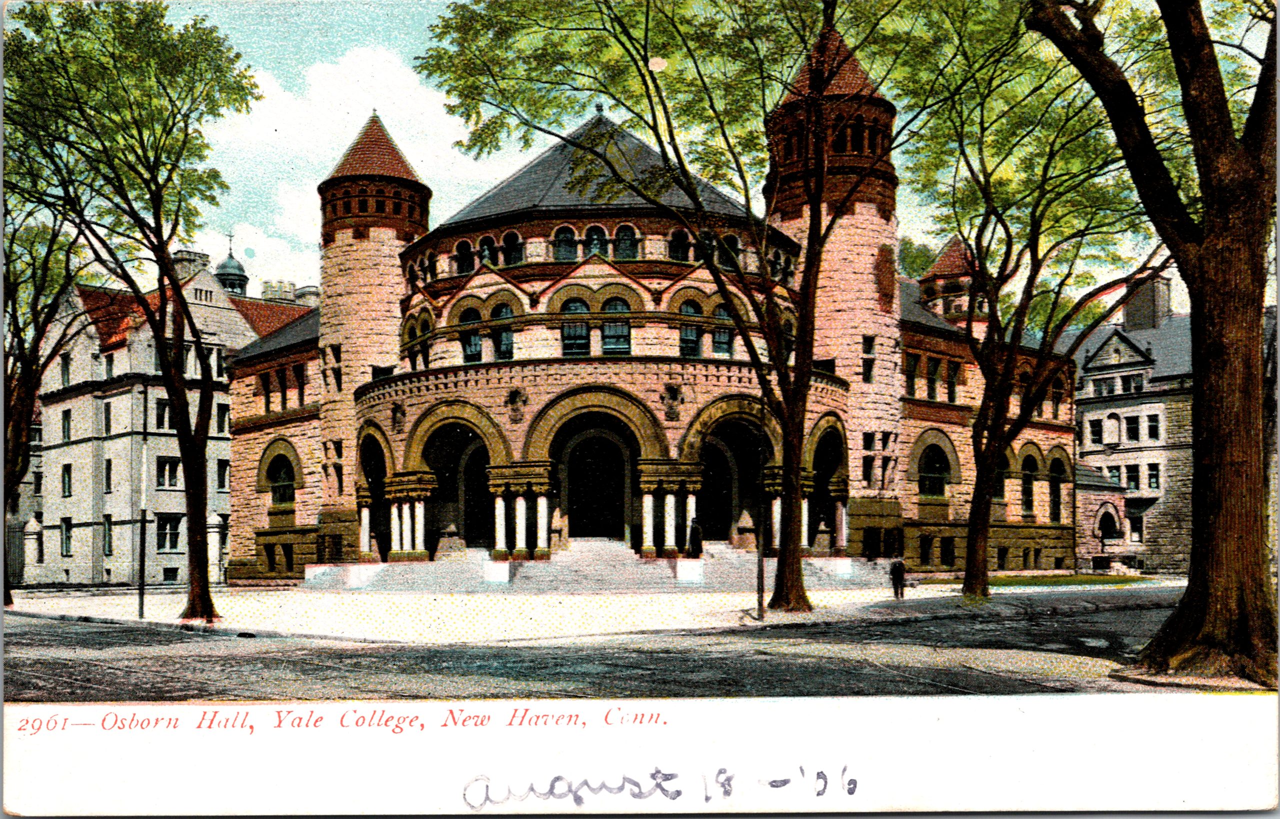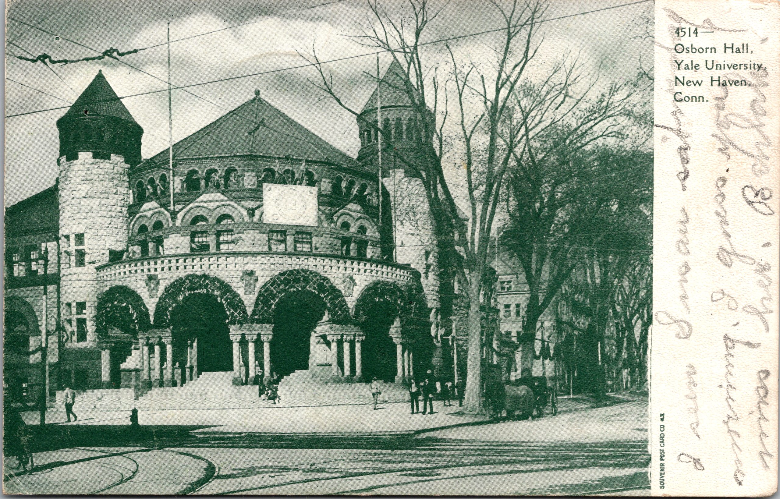 Osborn Hall, built in 1890 along College Street at the edge of Old Campus, was a richly detailed Romanesque-style classroom building funded by alumnus Charles J. Osborn ’66. Designed by architect Bruce Price, it quickly became one of the most recognizable façades facing the New Haven Green, with its arched windows, heavy masonry, and prominent corner tower. Despite its prominence, the building proved poorly suited to modern classroom needs due in part to its proximity to the heavily-trafficked College and Chapel Streets, and by the 1920s Yale sought to replace it as part of the university’s shift toward the new Collegiate Gothic plan. Osborn Hall was demolished in 1926—after just 36 years—to make way for Bingham Hall and the reconfiguration of the Old Campus perimeter. Its short life left a surprising imprint, remembered today largely through period photographs and postcards like these.