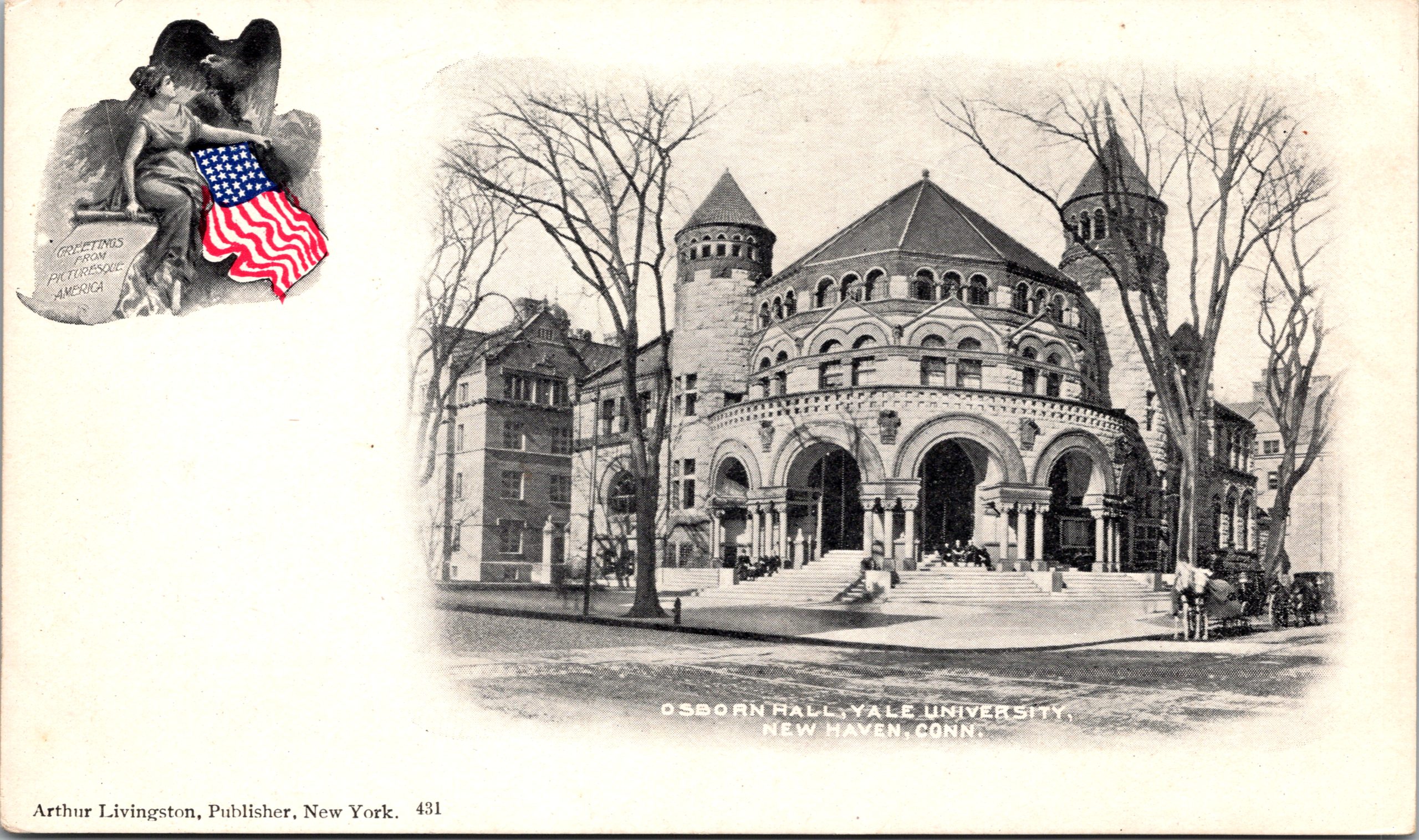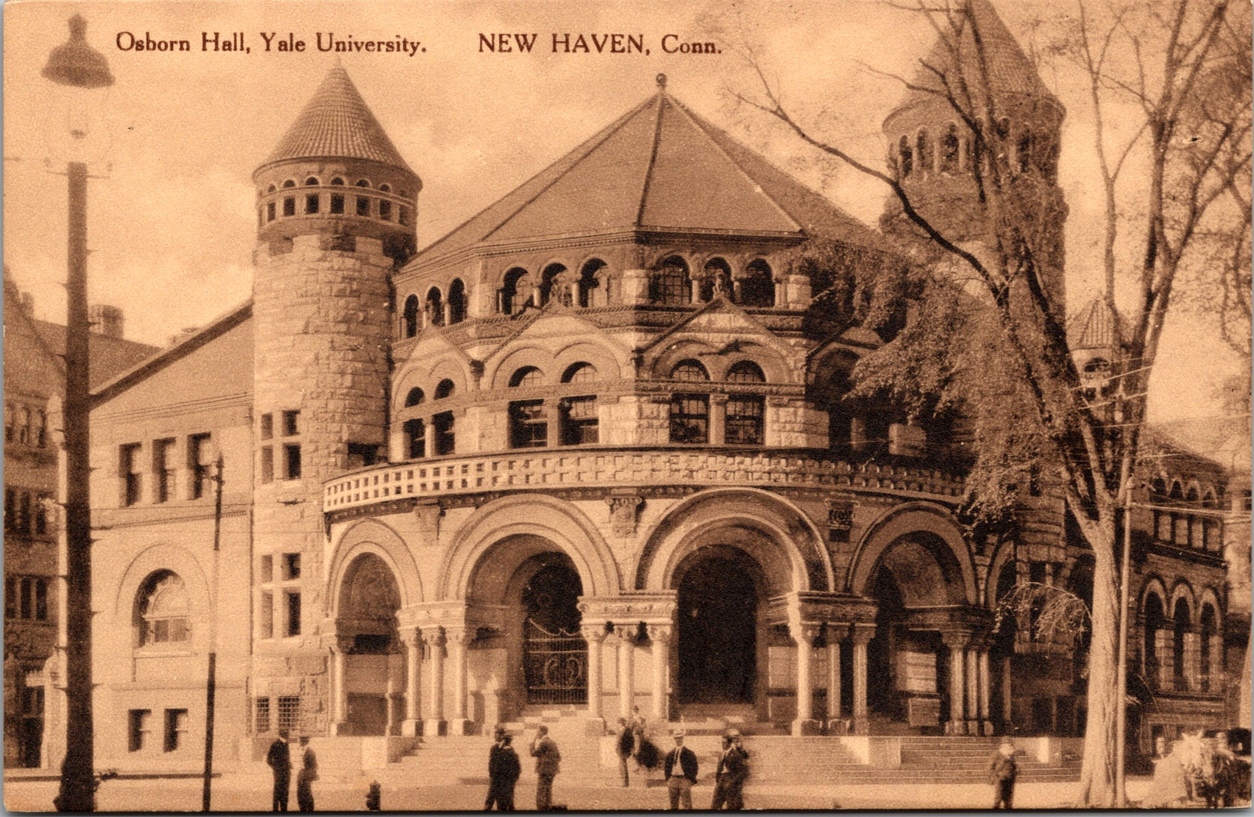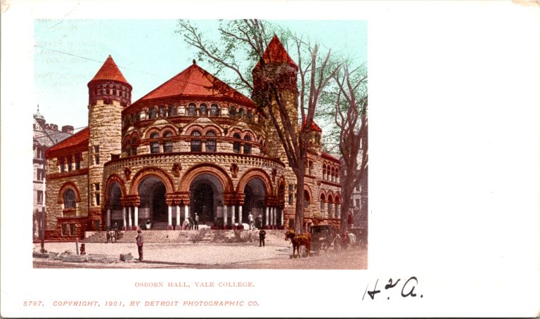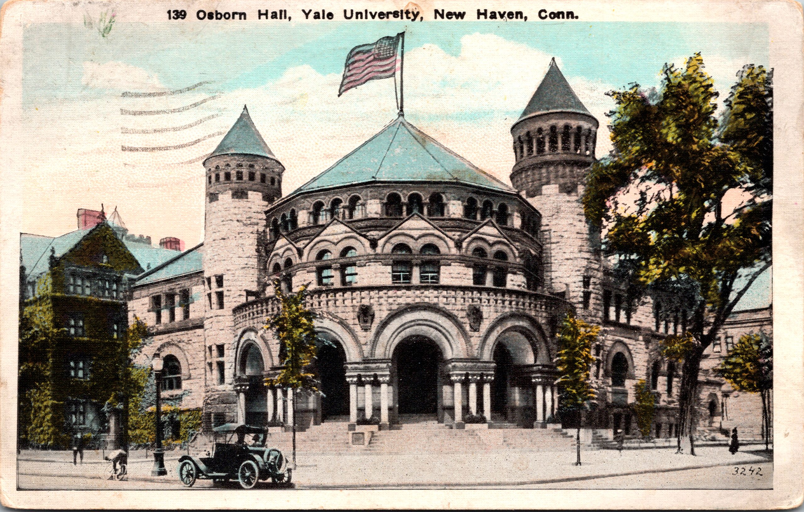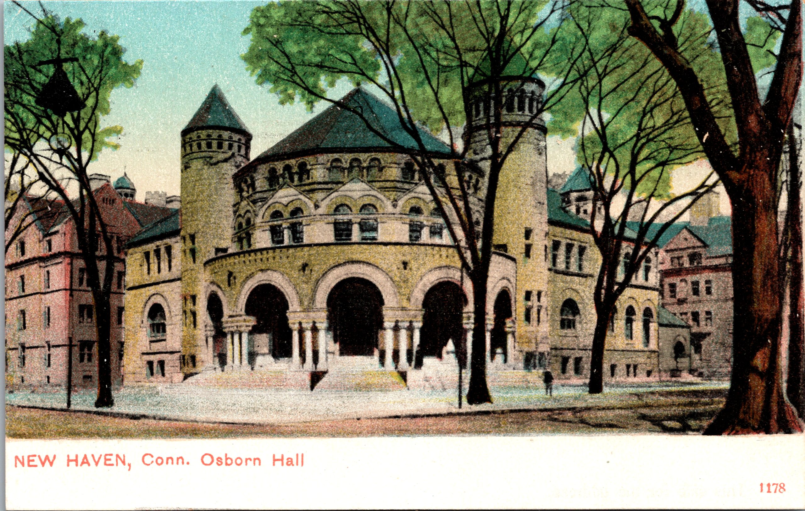 Osborn Hall, built in 1890 along College Street at the edge of Old Campus, was a richly detailed Romanesque-style classroom building funded by alumnus Charles J. Osborn ’66. Designed by architect Bruce Price, it quickly became one of the most recognizable façades facing the New Haven Green, with its arched windows, heavy masonry, and prominent corner tower. Despite its prominence, the building proved poorly suited to modern classroom needs due in part to its proximity to the heavily-trafficked College and Chapel Streets, and by the 1920s Yale sought to replace it as part of the university’s shift toward the new Collegiate Gothic plan. Osborn Hall was demolished in 1926—after just 36 years—to make way for Bingham Hall and the reconfiguration of the Old Campus perimeter. Its short life left a surprising imprint, remembered today largely through period photographs and postcards like these.