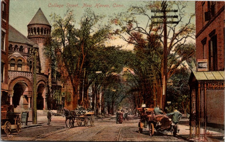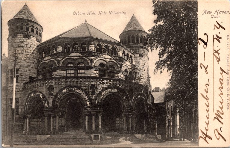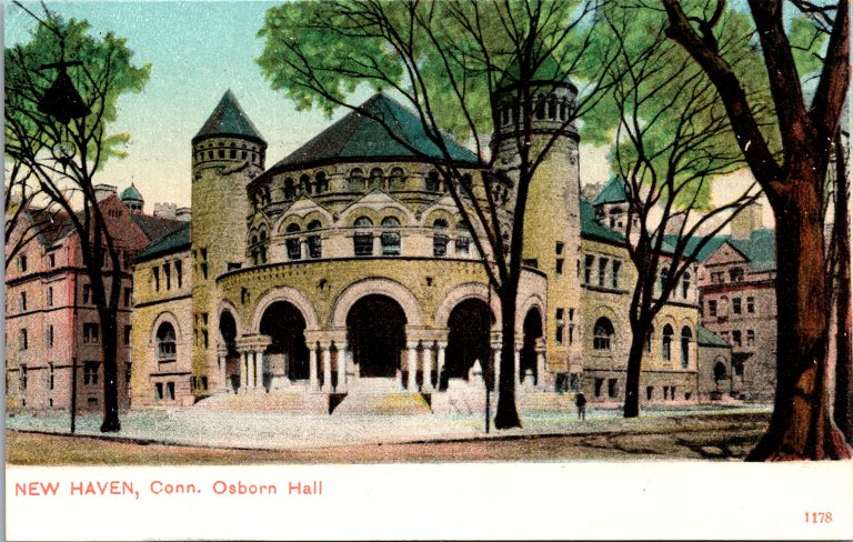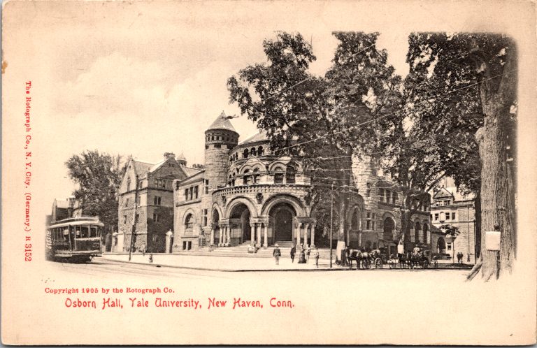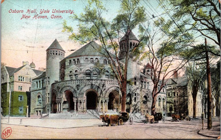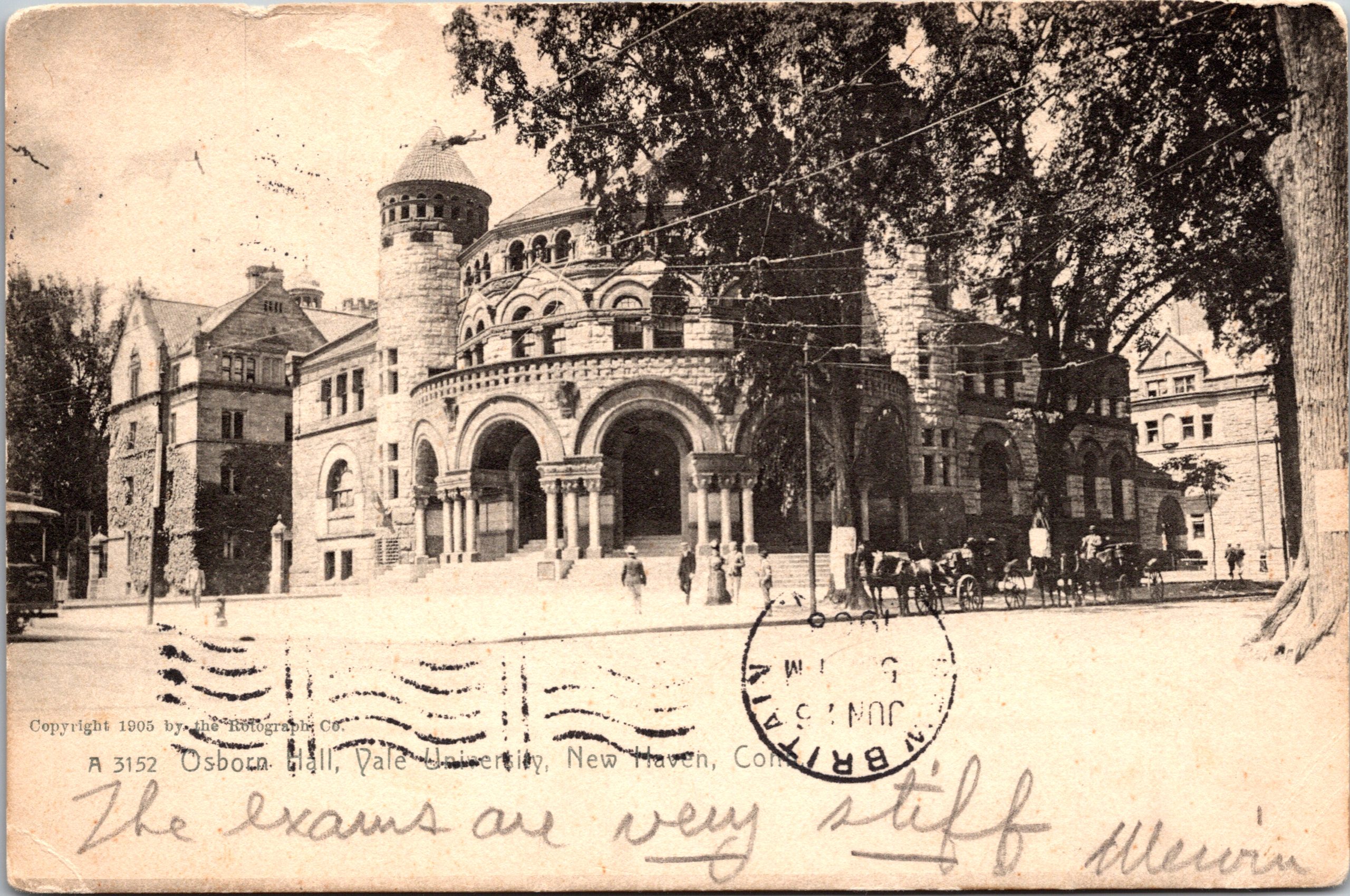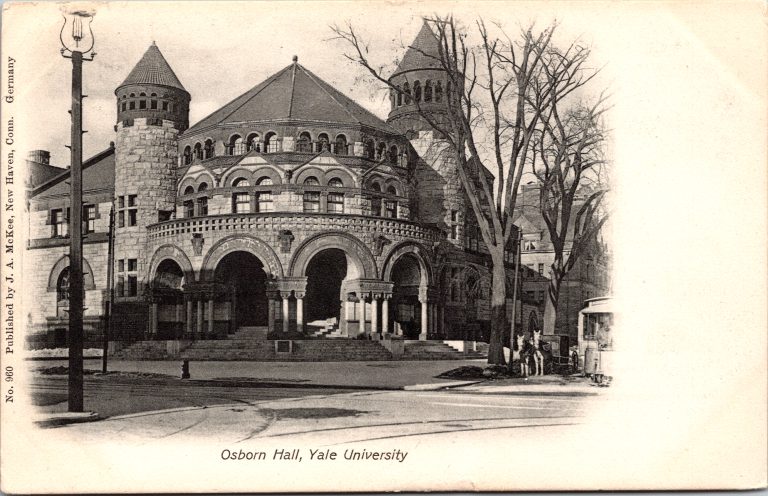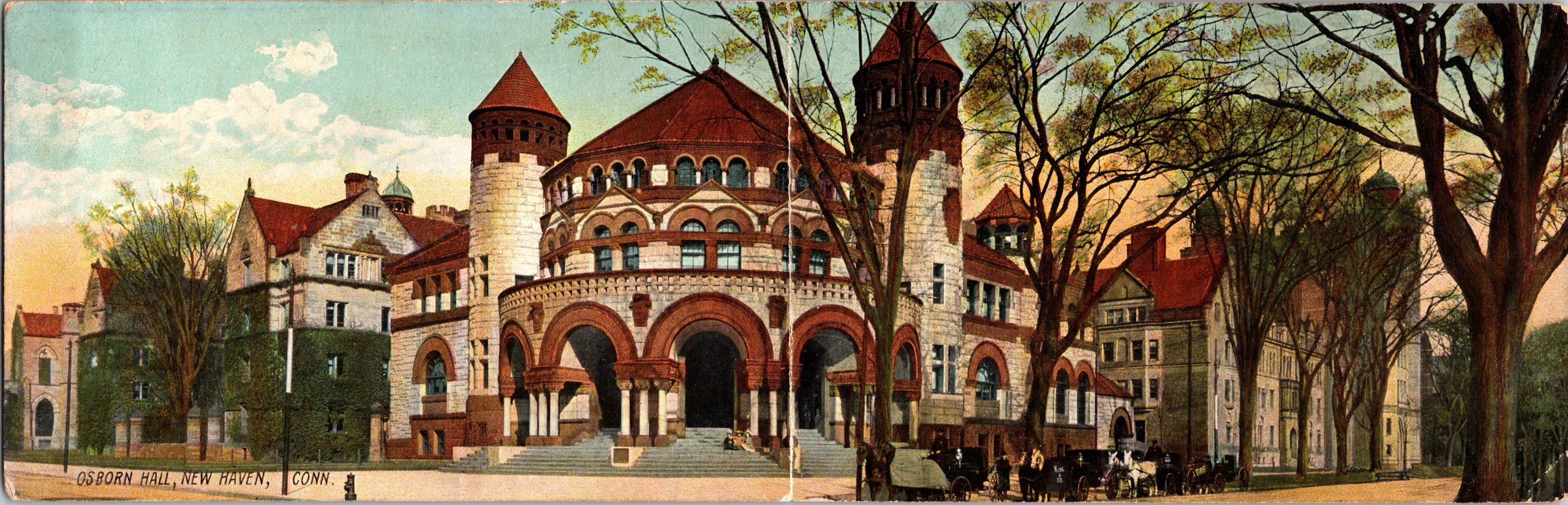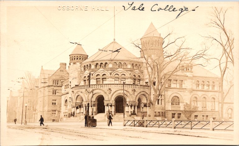 Osborn Hall, built in 1890 along College Street at the edge of Old Campus, was a richly detailed Romanesque-style classroom building funded by alumnus Charles J. Osborn ’66. Designed by architect Bruce Price, it quickly became one of the most recognizable façades facing the New Haven Green, with its arched windows, heavy masonry, and prominent corner tower. Despite its prominence, the building proved poorly suited to modern classroom needs due in part to its proximity to the heavily-trafficked College and Chapel Streets, and by the 1920s Yale sought to replace it as part of the university’s shift toward the new Collegiate Gothic plan. Osborn Hall was demolished in 1926—after just 36 years—to make way for Bingham Hall and the reconfiguration of the Old Campus perimeter. Its short life left a surprising imprint, remembered today largely through period photographs and postcards like these.