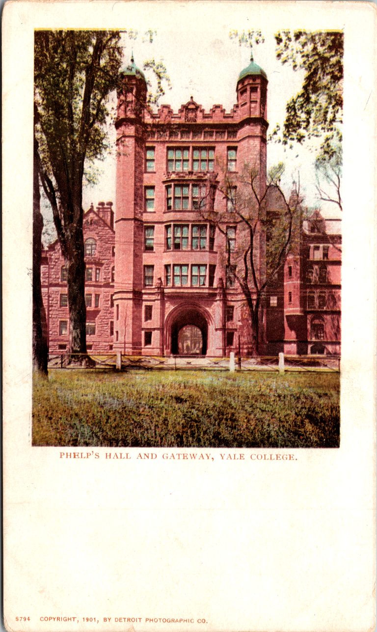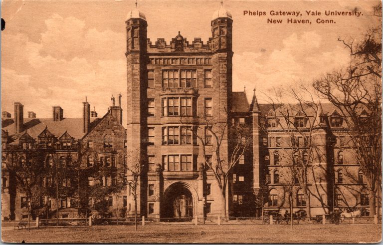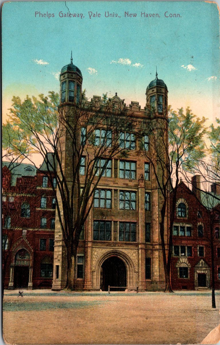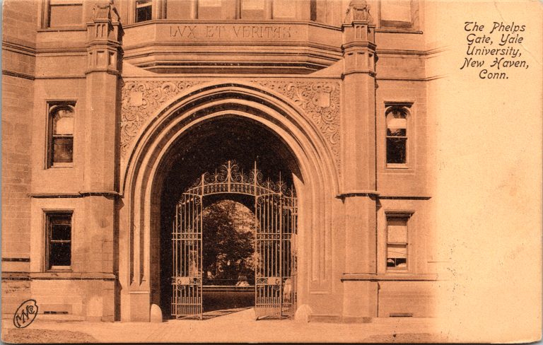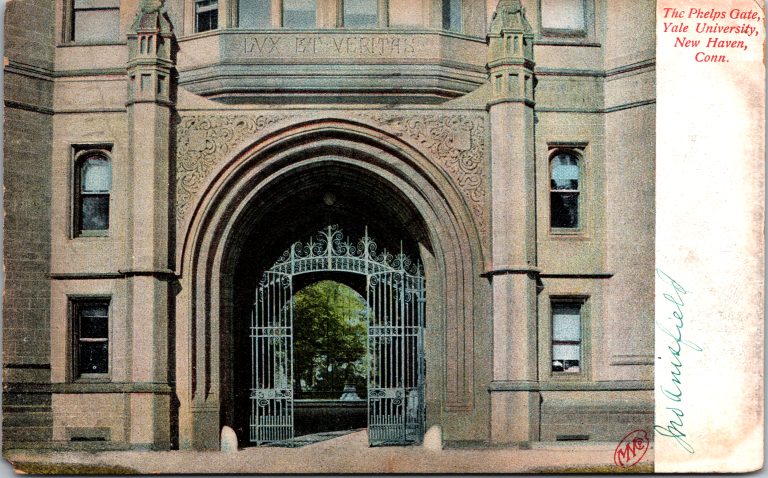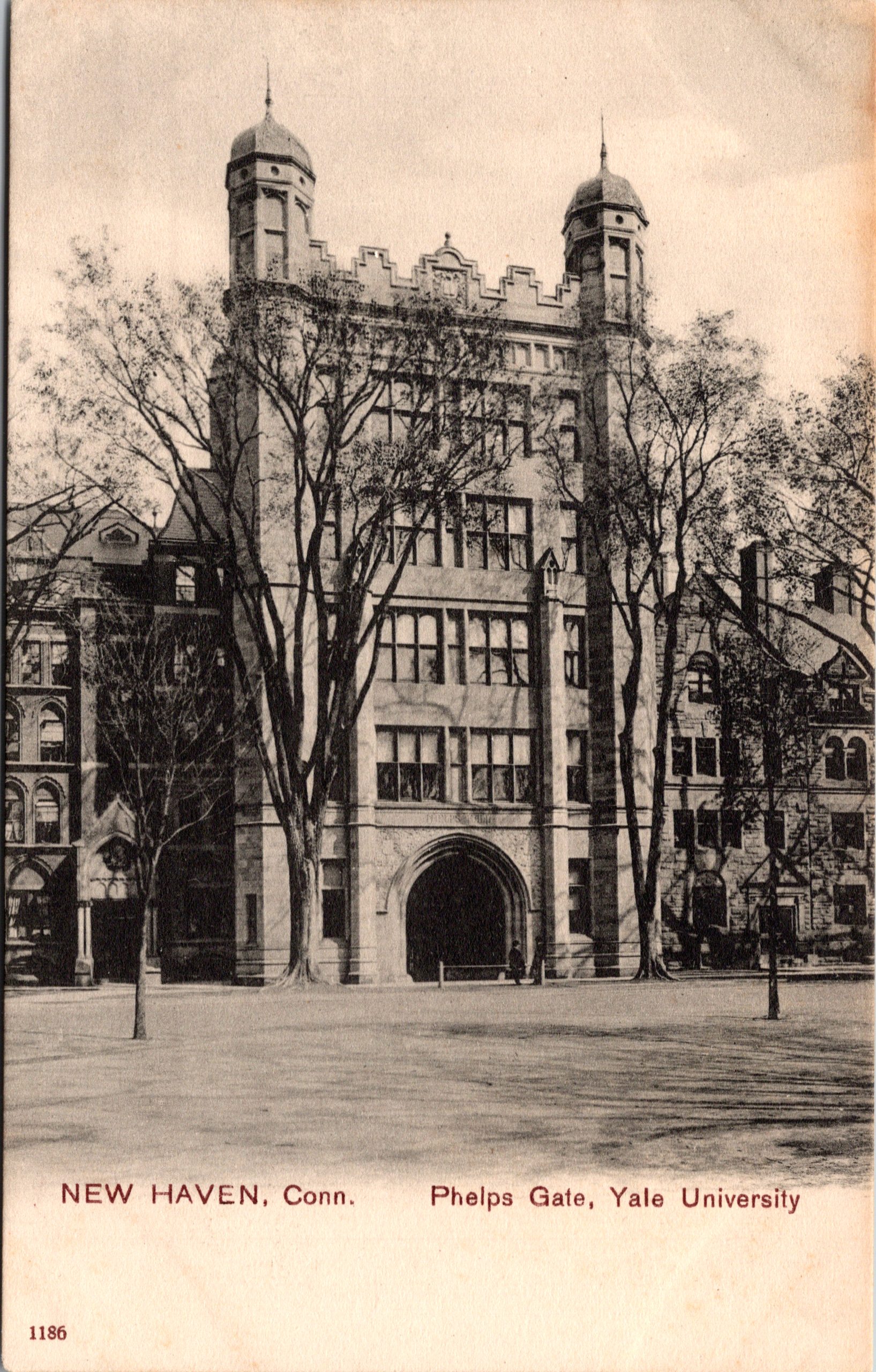 Phelps Gate, completed in 1896, serves as the grand entrance to Old Campus from College Street. Designed by architect Charles C. Haight, the building and its central archway were part of Yale’s late-19th-century effort to transform the formerly open, irregular Old Campus into a cohesive quadrangle. The gate quickly became a symbolic threshold—through which enter both freshmen students in Yale College during their first day on campus, as well as graduates of Yale schools and programs on Commencement Day. Its tower originally housed the Yale College registrar and later various administrative offices.  An especially visible, timeless, and classic fixture on Old Campus, the building—appropriately—is now home for Yale’s Classics department.