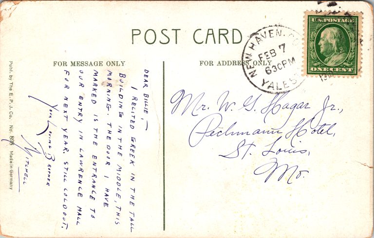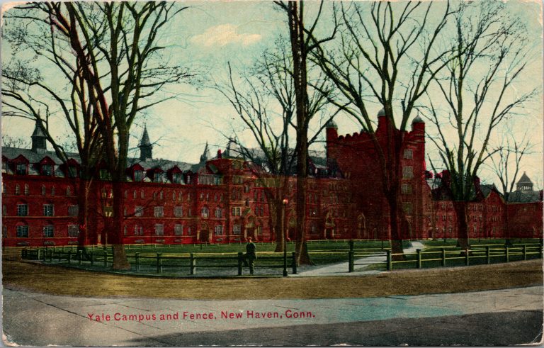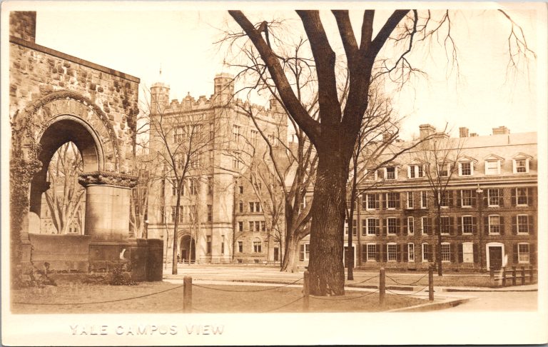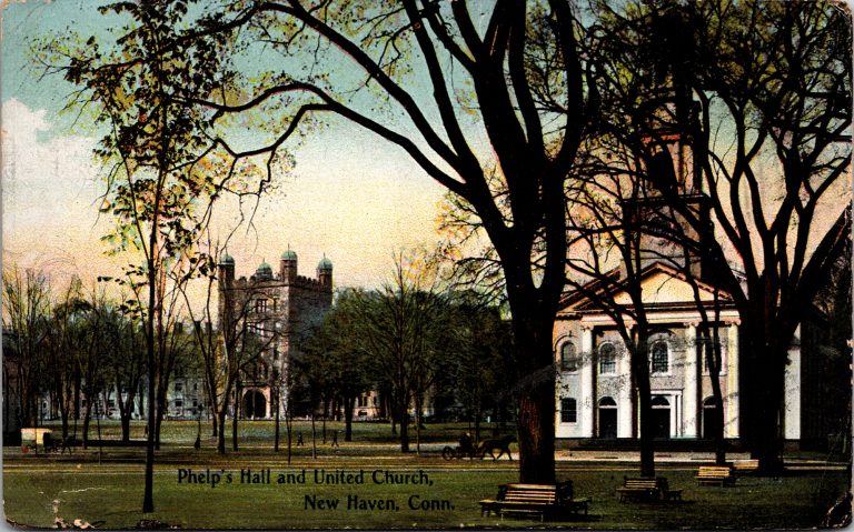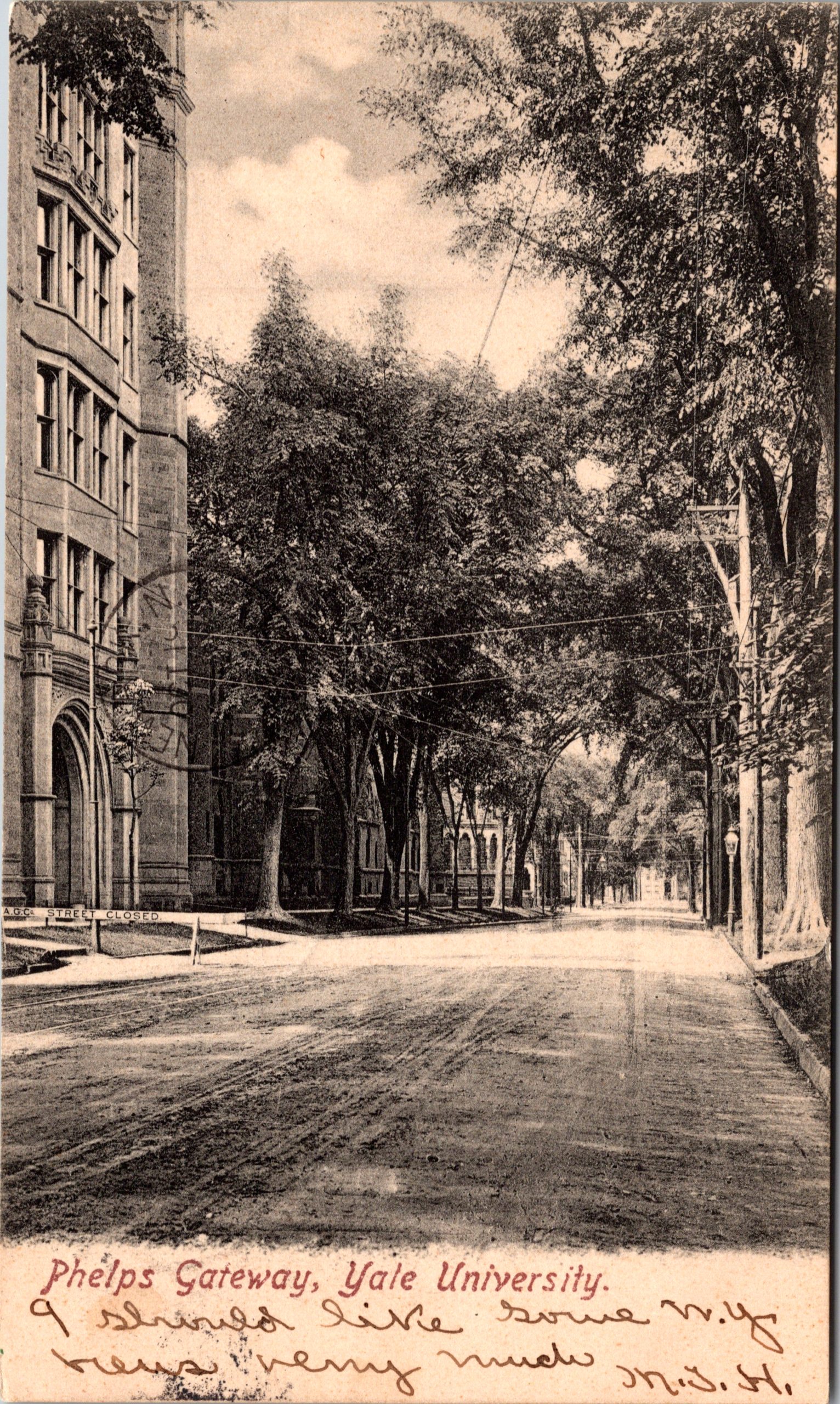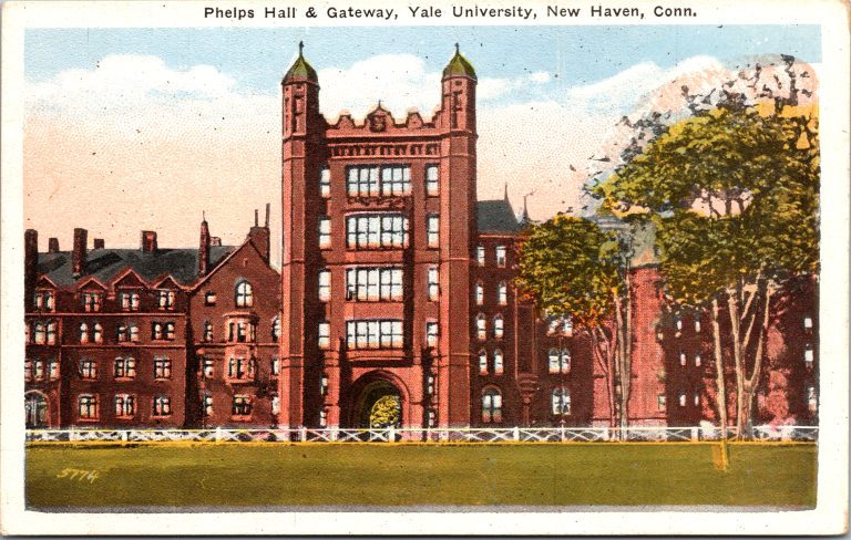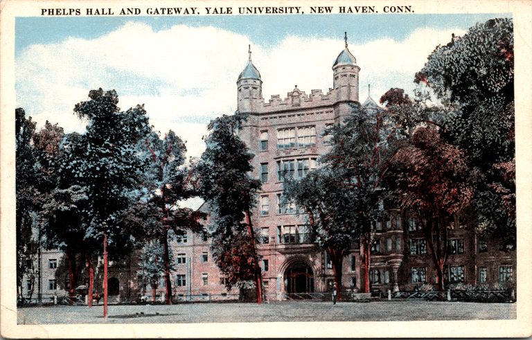 Phelps Gate, completed in 1896, serves as the grand entrance to Old Campus from College Street. Designed by architect Charles C. Haight, the building and its central archway were part of Yale’s late-19th-century effort to transform the formerly open, irregular Old Campus into a cohesive quadrangle. The gate quickly became a symbolic threshold—through which enter both freshmen students in Yale College during their first day on campus, as well as graduates of Yale schools and programs on Commencement Day. Its tower originally housed the Yale College registrar and later various administrative offices.  An especially visible, timeless, and classic fixture on Old Campus, the building—appropriately—is now home for Yale’s Classics department.